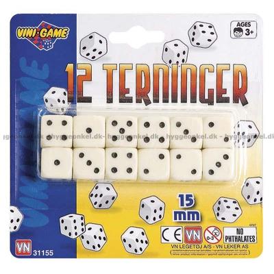 12 elfenbenfargede terninger med en sidelengde på 15 mm. Terningene kan benyttes i haugevis av morsomme spill.