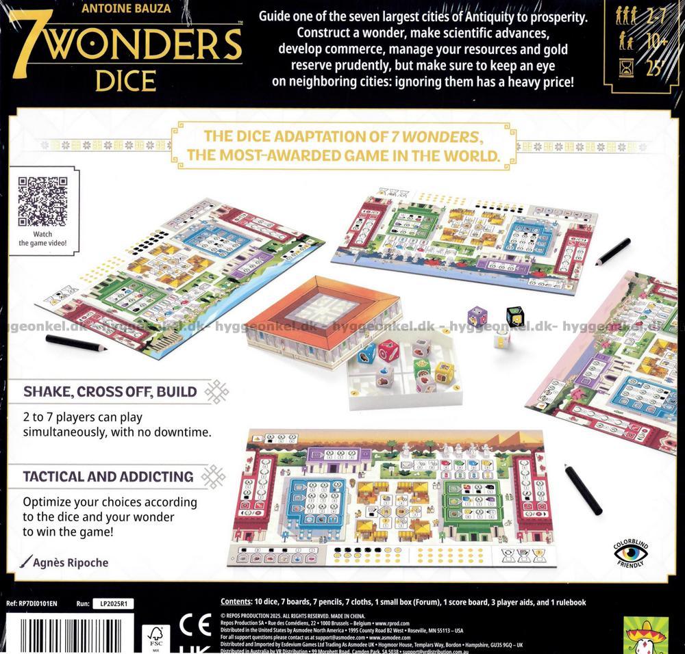 I 7 Wonders: Dice tar du kontroll over en av oldtidens mektige byer, hvor ambisjon, strategi og flaks går hånd i hånd. Her er terningene dine verktøy for å forme en sivilisasjon som vil bli husket for sine underverker, sin lærdom og sin makt. Hver runde sender du dine byggmestere ut for å reise bygninger, styrke hæren, utforske nye vitenskapelige veier og utvikle din økonomi – alt gjennom symbolene terningene viser.