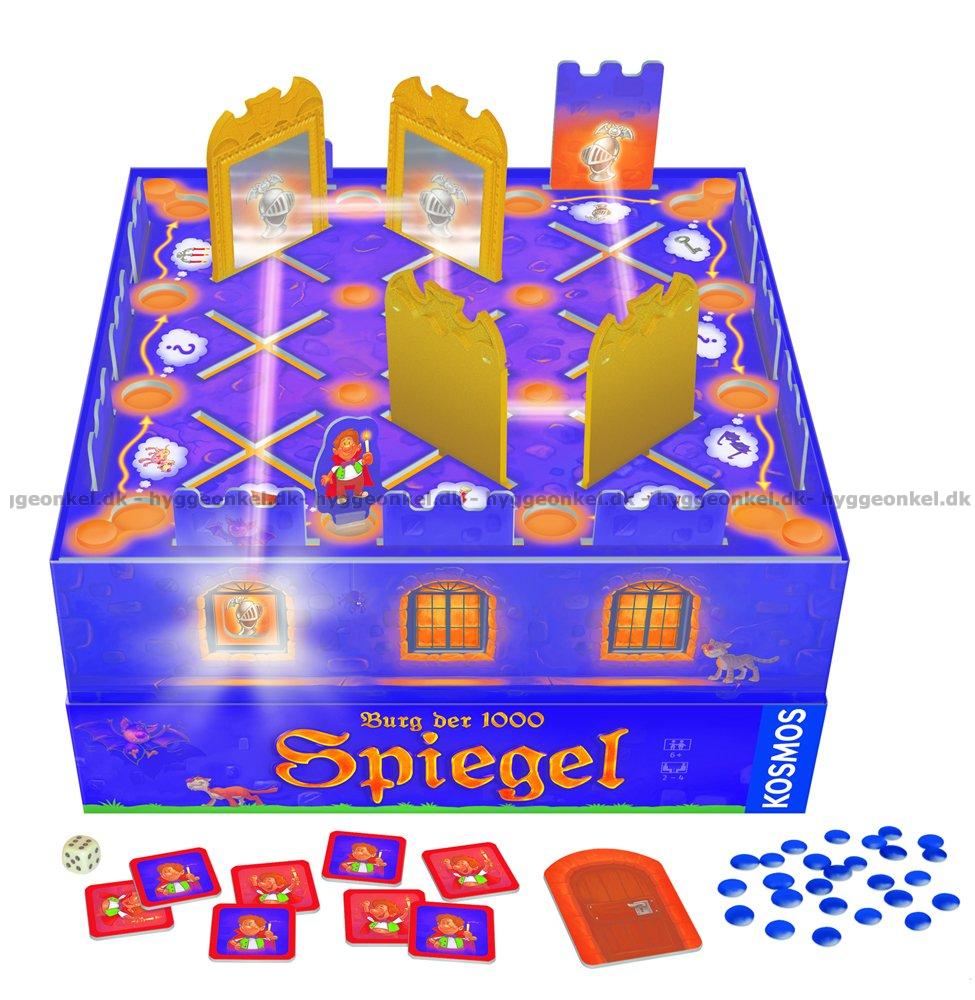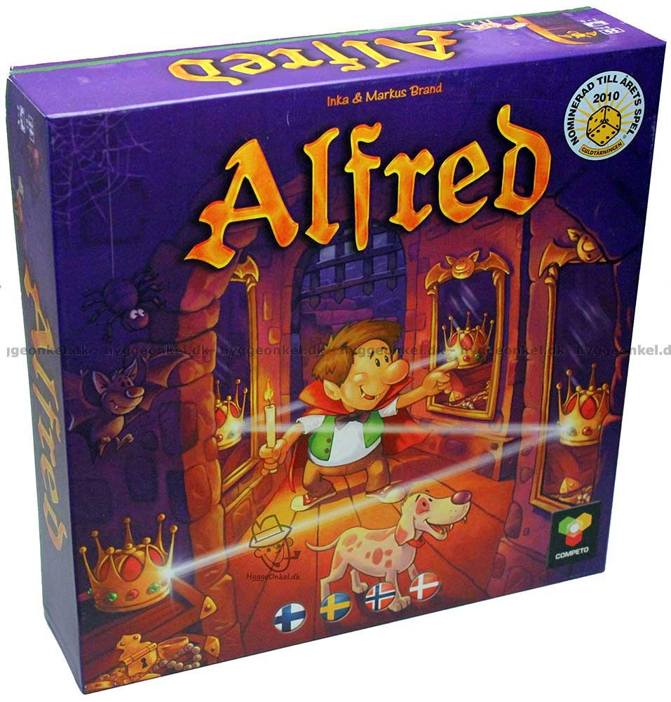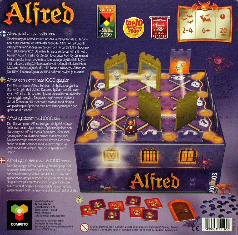 Esken inneholder 1 spillebrett, 4 speil, 12 borgkort og 1 Alfred-brikke, samt norske spilleregler (på kun 3 sider, så du er kjapt i gang).