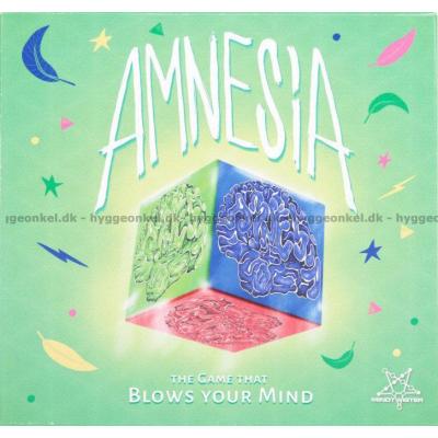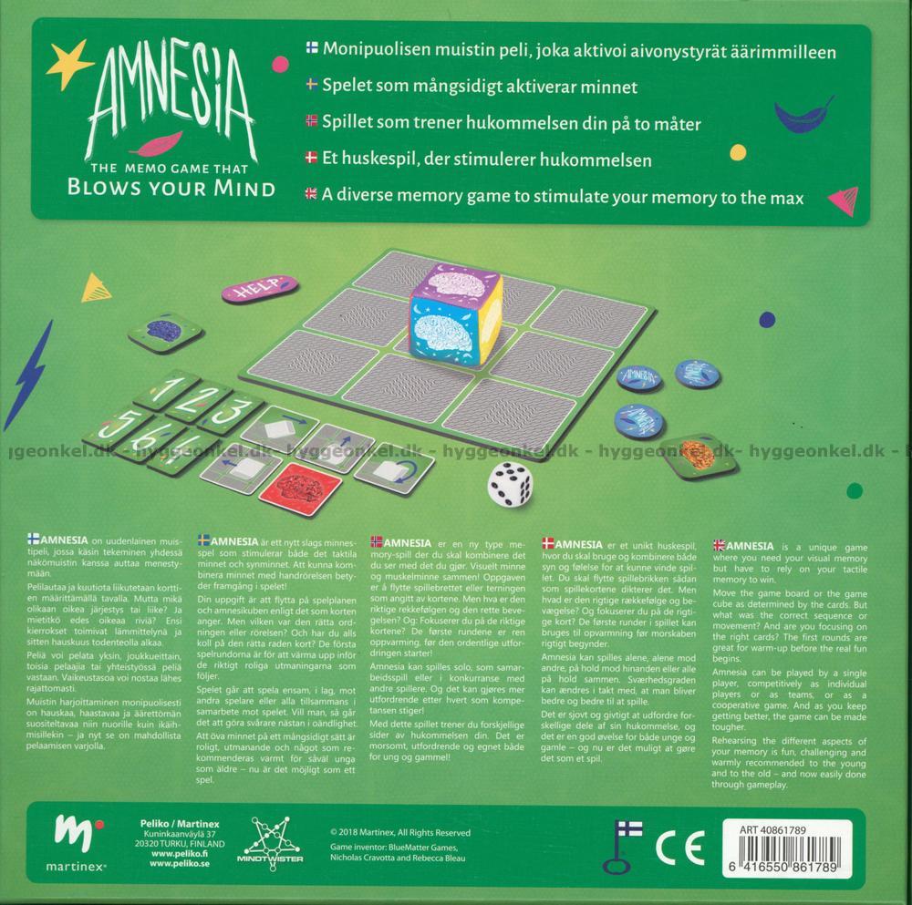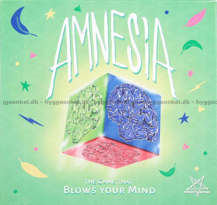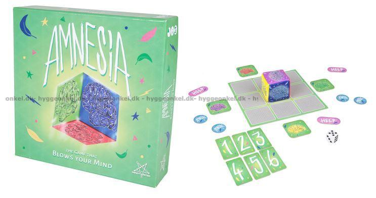 Spillebrett, Amnesia-kube, terning, kort og pappbrikker.
