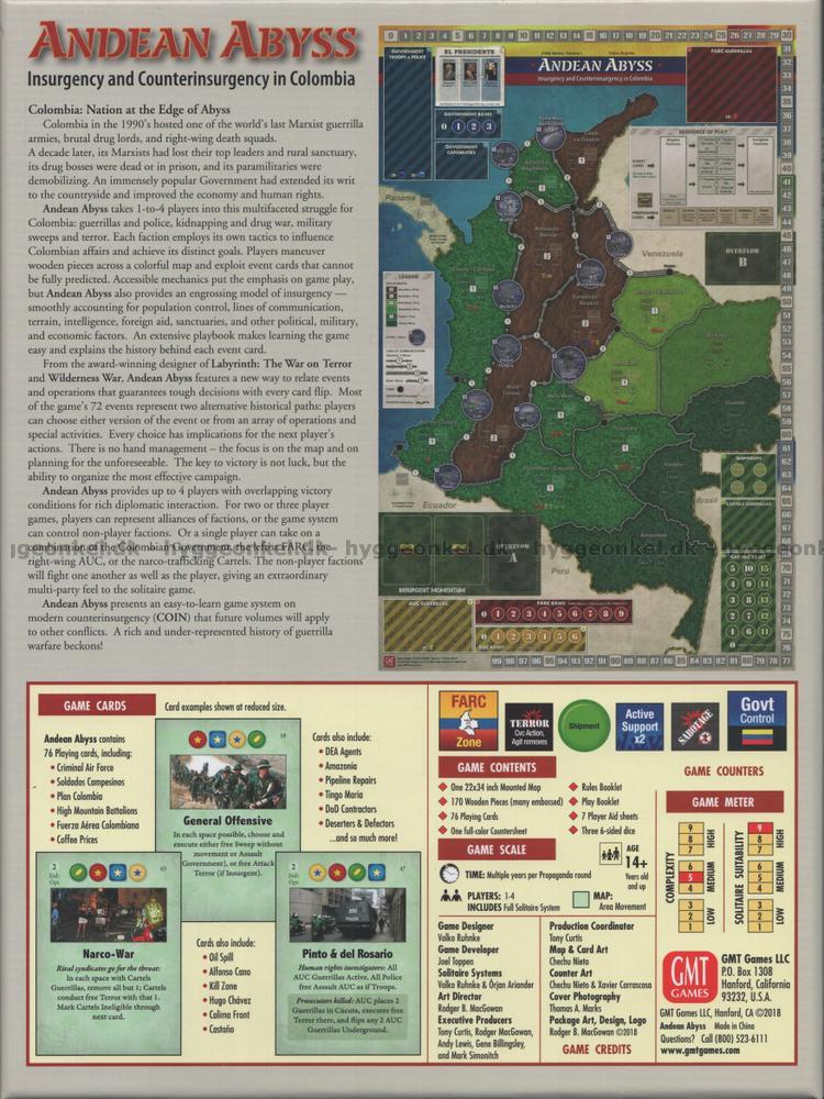 Andean Abyss tar 1-4 spillere med på en multifasettert kampanje om makten over Colombia, med gerilja og politi, kidnappinger og narkokrig, militære operasjoner og terror. Hver av de fire fraksjonene har sine egne styrker og strategier som må brukes for å påvirke situasjonen i Colombia og oppnå sine mål. Spillerne plasserer og flytter rundt på 160 trebrikker på kartet, mens de forsøker å dra fordel av hendelseskort som man aldri helt kan regne med. Lettforståelige regler og komponenter sikrer at fokus er på spillingen, men Andean Abyss byr også på en fengslende illustra-sjon av opprør og kriminalitetsbekjempelse i Colombia, hvor det på en elegant måte tas høyde for befolkningskontroll, kommunikasjonslinjer, terreng, etterretning, nødhjelp og en mengde andre politiske, militære og økonomiske faktorer.