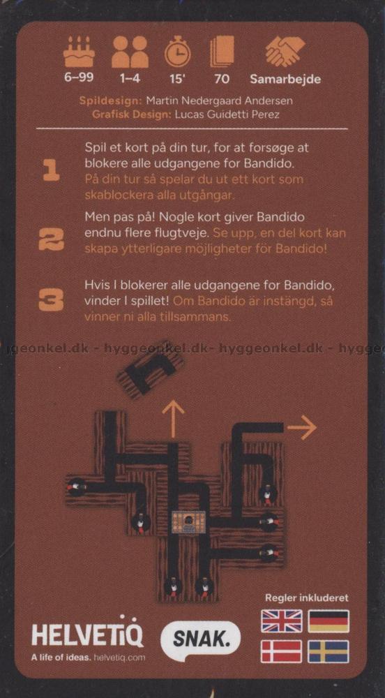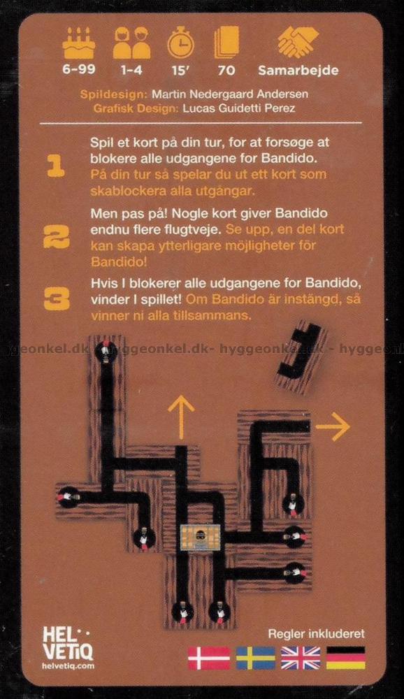 Dere er alle på samme lag og vinner kun hvis dere klarer å blokkere alle utganger før kortbunken er tom. Men pass på – et eneste feil kort kan åpne nye fluktruter og gjøre det umulig å vinne. Spenningen stiger jo nærmere Bandido kommer friheten.