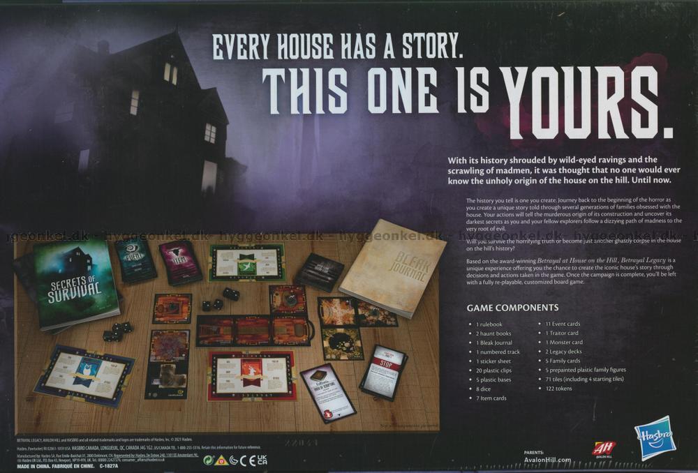 Spillet er basert på det prisvinnende Betrayal at House on the Hill, og Betrayal Legacy er en unik opplevelse hvor dere får sjansen til å nedtegne det ikoniske husets historie gjennom deres egne handlinger og beslutninger. Når kampanjen er slutt, står dere tilbake med et spill som kan spilles mange ganger, men som er deres helt egne, unike spillopplevelse.