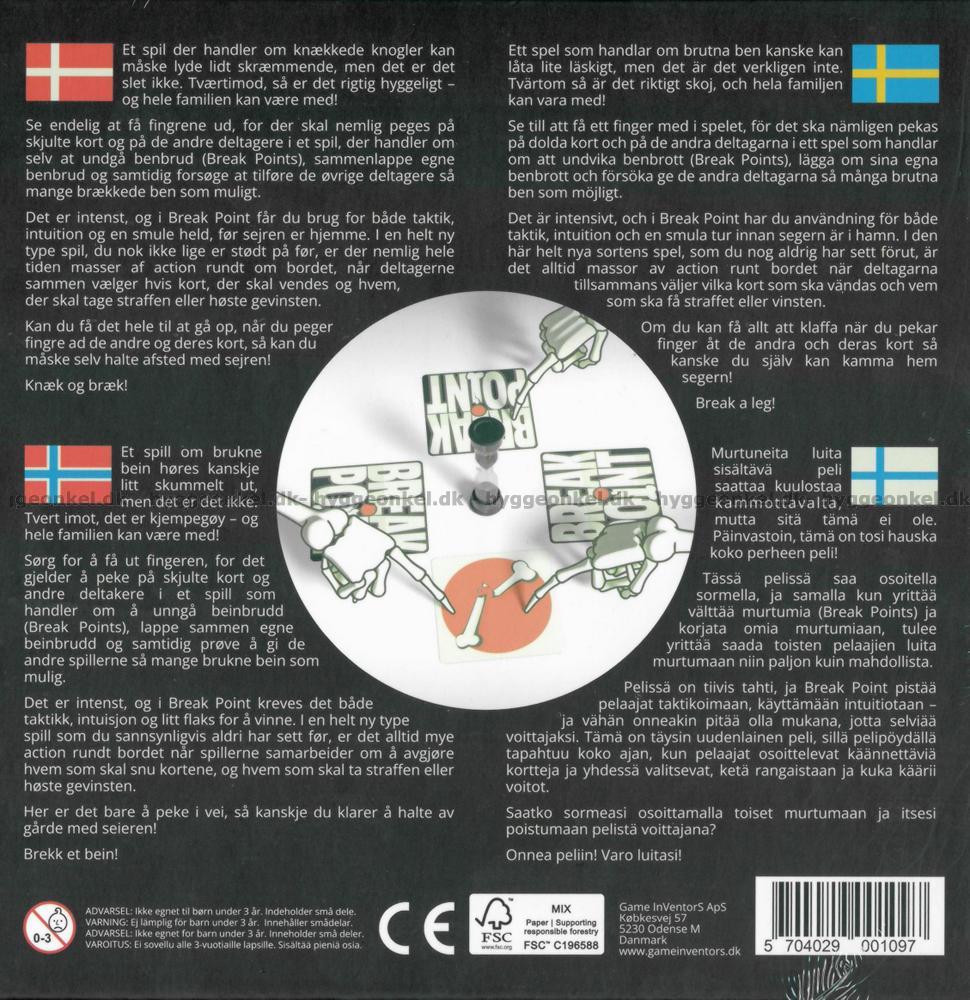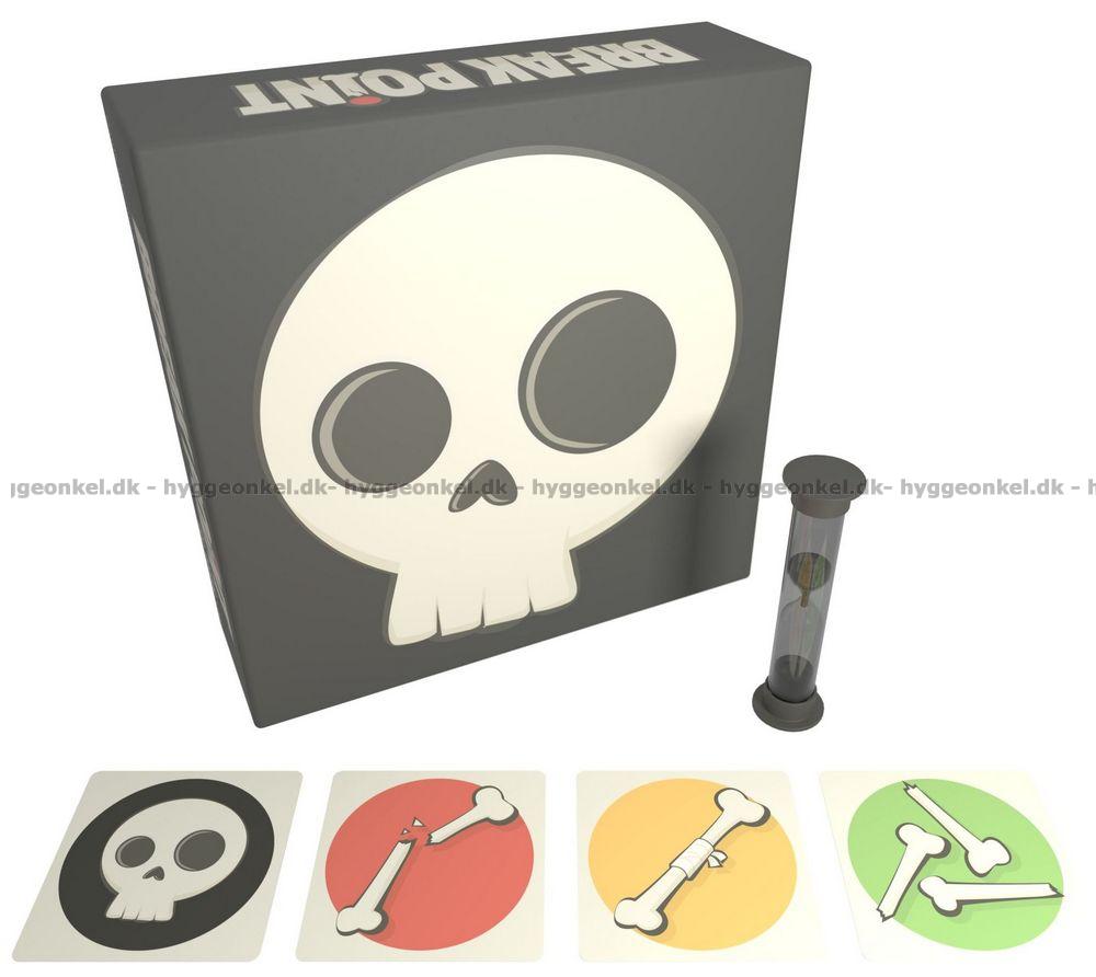 Hvis du liker å peke finger på andre, er Break Point det perfekte spillet for deg. Her gjelder det å unngå benbrudd mens du kjemper for å samle færrest mulig break points. Underveis blir du utfordret av en unik blanding av taktikk, flaks og intuisjon, og spenningen øker jo nærmere du kommer seieren. Vinneren er den som slipper unna med færrest benbrudd og dermed færrest break points, men veien dit er fylt med dramatikk og nervepirrende øyeblikk. Break Point er et spill du ikke har sett før, og det lover masse hjertebank og følelsesmessige utbrudd hver gang det kommer på bordet.