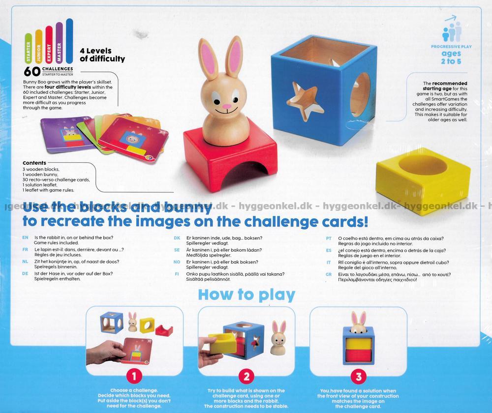 Man legger frem et kort med en oppgave og barnet skal så forsøke å stille opp figurene slik at de passer med kortet. Det kan f.eks. være at man kun kan se kaninens hode og den gule klossen. Barnet skal da sette kaninen inn i den gule klossen.