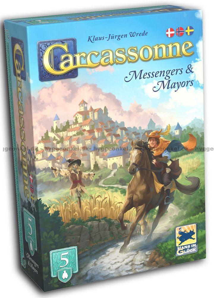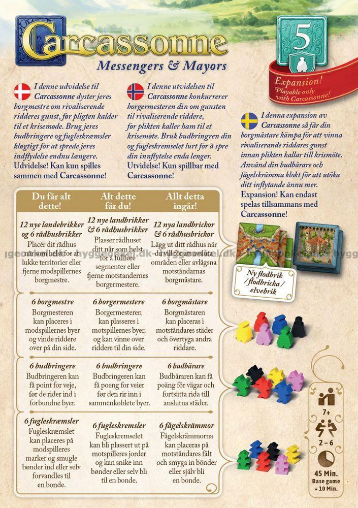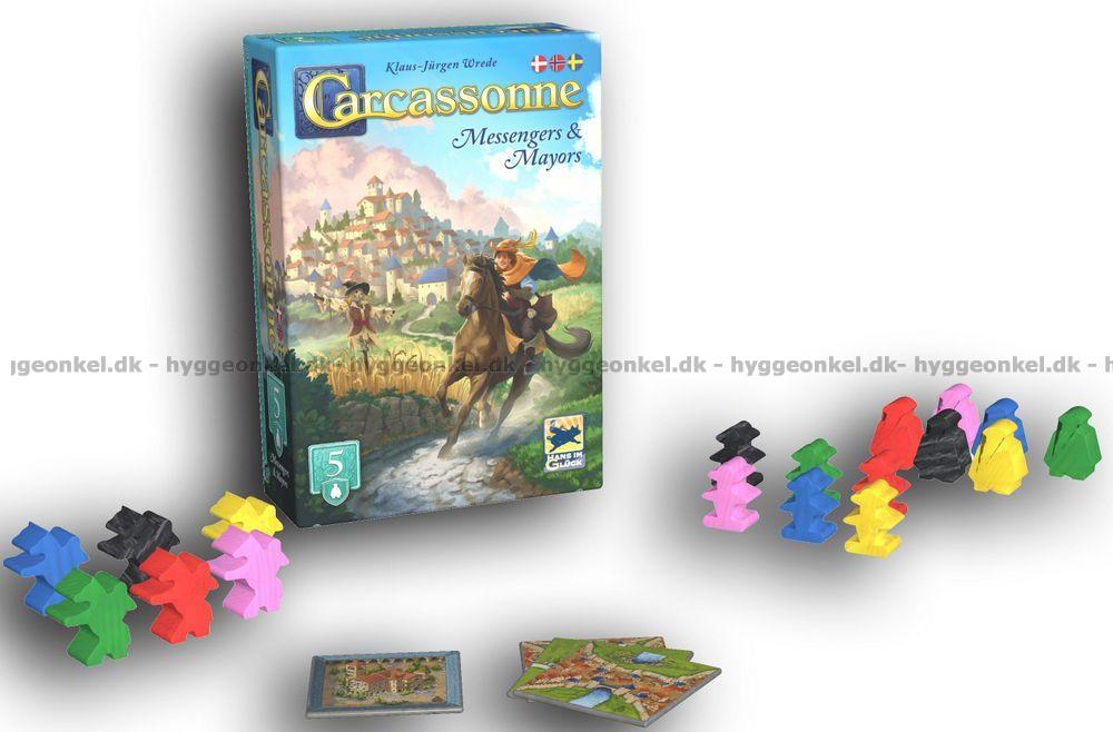 I Budbringere & Borgermestere får Carcassonne et friskt pust av strategi og bevegelse. Utvidelsen introduserer tre nye brikker, som hver gir deg nye måter å påvirke spillet på. Borgermesteren kan skape innflytelse i byene og endre maktbalansen, budbringeren beveger seg fra vei til vei, mens fugleskremselet gir deg mulighet til å forme markene og forberede dine neste trekk. I tillegg introduserer utvidelsen også rådhus, som gir spillerne flere taktiske vurderinger.