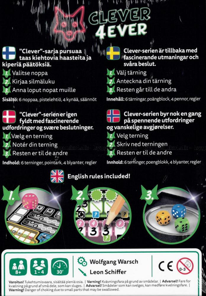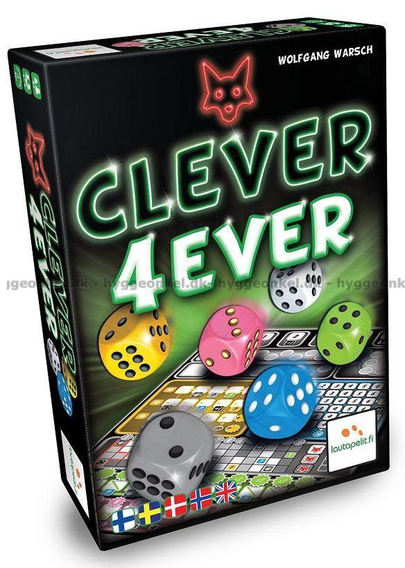 Clever 4Ever er et spill i den populære "Clever"-serien. Her gjelder det å tenke taktisk, utnytte terningene smart og skape de best mulige kombinasjonene i fem fargerike felt på spilleblokken. Hver beslutning teller, for tallene du velger, påvirker dine neste muligheter – og til og med dine motspillere!