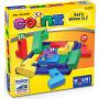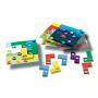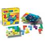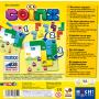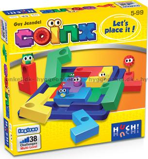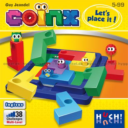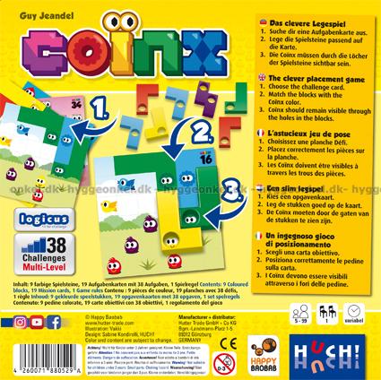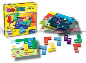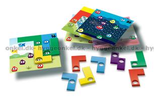 Spillet måler 17 x 17 cm. Det inneholder spillområde, 9 plastbrikker og