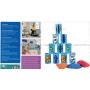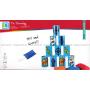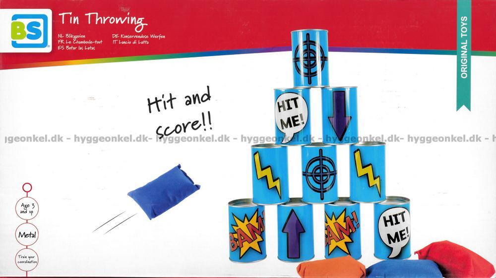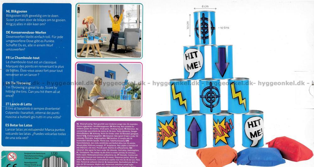 Her får du 10 metallbokser og 3 poser til å kaste med.