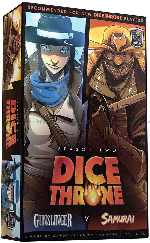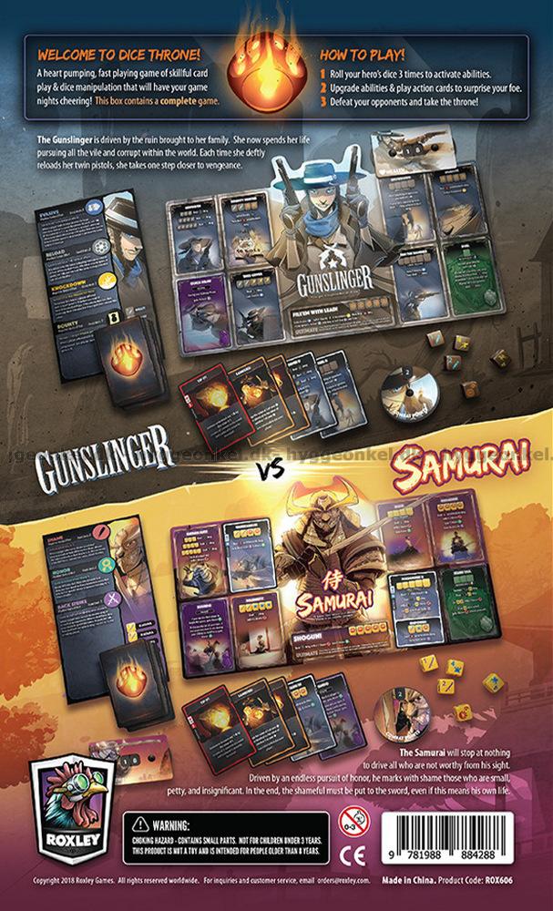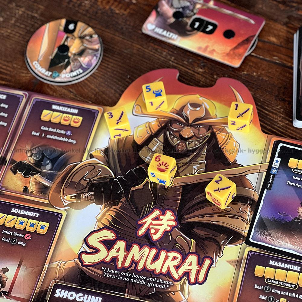 Dice Throne: Gunslinger vs Samurai setter scenen for en dynamisk duell, hvor hevnens kraft møter ære og disiplin i et visuelt og taktisk spennende oppgjør. Gunslingeren angriper med lynraske pistolskudd, hardtslående dusører og styrkende omladninger, mens Samuraienes rolige fokus gjør ham i stand til å påføre Skam og snu situasjonen med presise, æresdrevne slag.