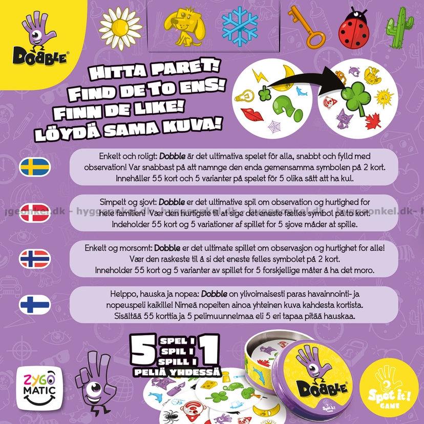 Det medfølger spilleregler til fem forskjellige små, hyggelige spill. I alle spillene gjelder det å finne matchende symboler på to kort.