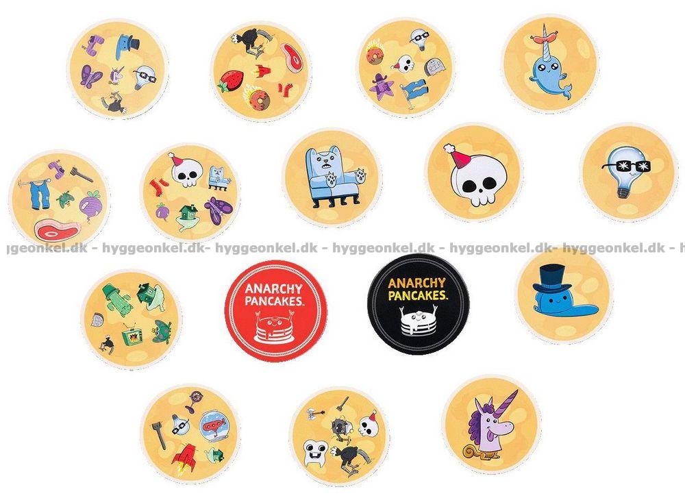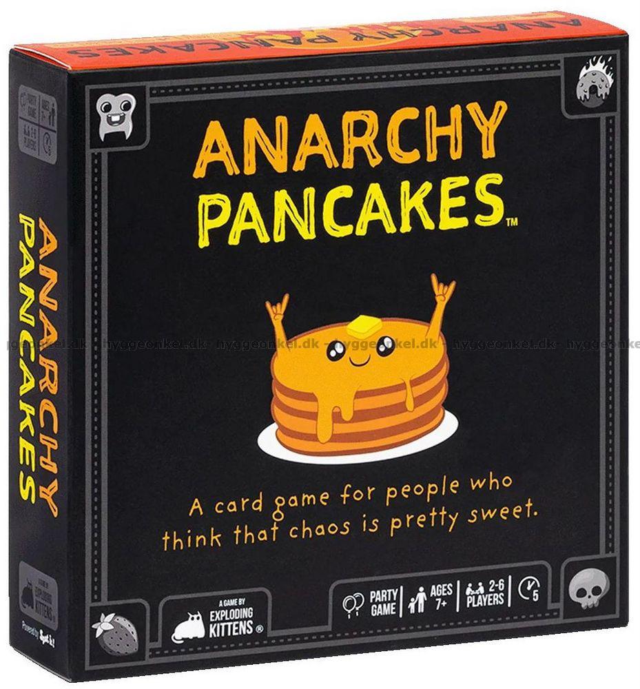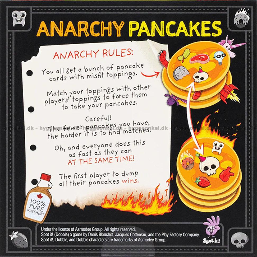 Dobble: Anarchy Pancakes er et fartsfylt og kaotisk kortspill, hvor det gjelder å bli kvitt alle sine pannekakekort før de andre spillerne. Hvert kort viser forskjellige toppinger, og du kan legge et av dine kort på en annens bunke hvis du finner en matchende topping. Alle spiller samtidig, så tempoet er høyt og kaoset sprer seg raskt. Når du har spilt et kort, kommer du nærmere seieren, og den første spilleren som blir kvitt alle sine kort, roper “Anarchy Pancakes!” og vinner runden.