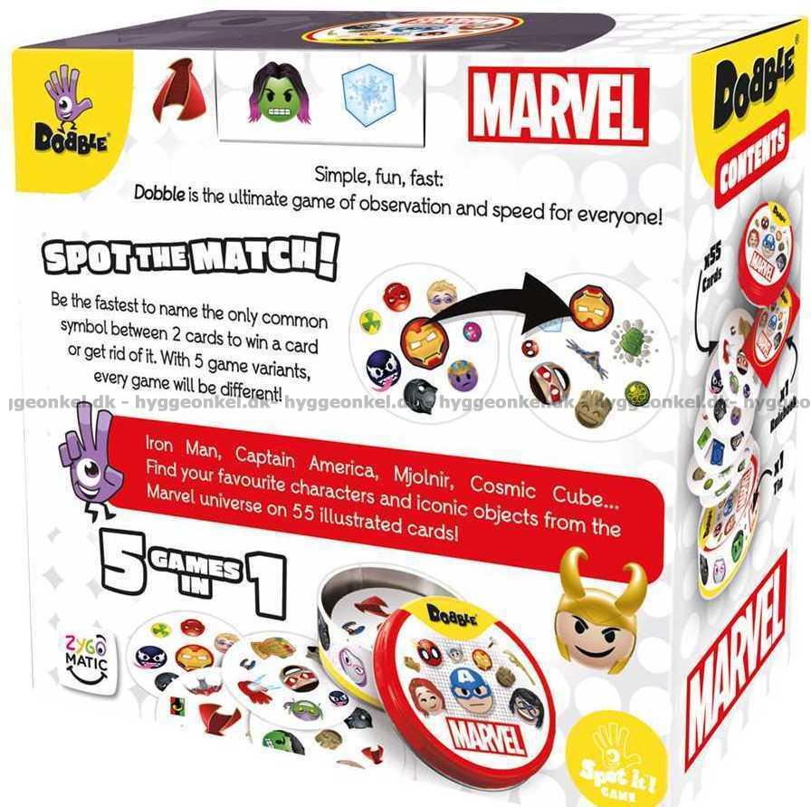 Dobble: Marvel kombinerer det populære Dobble med helter og skurker fra Marvel-universet. Kortene er fylt med velkjente figurer, som gjør spillet ekstra levende og lett gjenkjennelig.