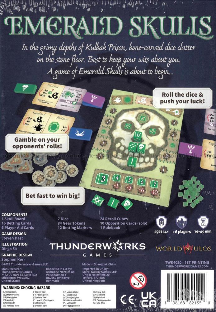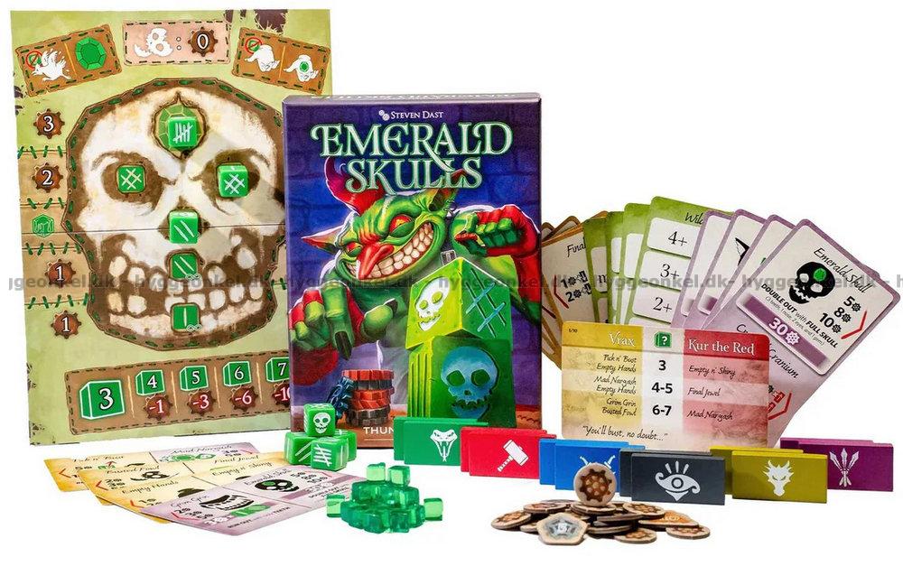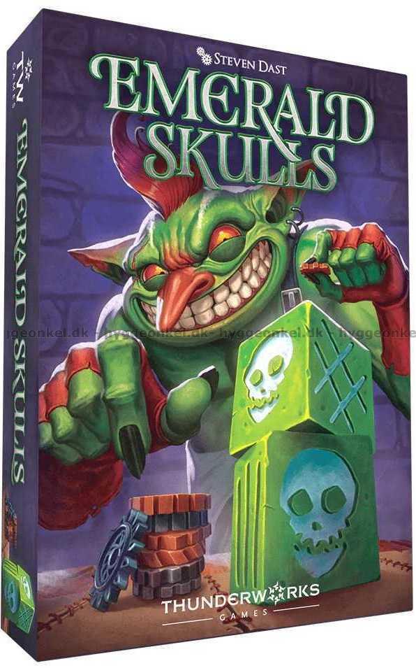 Emerald Skulls er et intenst terning- og veddemålsspill, hvor du trer inn i de dystre dypene av Kulbak-fengselet. Her samles fangene rundt goblinen Nargash og hans forheksede ben-terninger, mens skrik og latter fyller de mørke gangene. Som spiller tar du på omgang rollen som tumbleren, som presser lykken ved å plassere terninger på hodeskallebrettets fem nivåer, eller som gambler, som lynraskt plasserer veddemål på utfallet av kastene. Jo raskere du satser, desto større kan gevinsten bli, men risikoen er alltid til stede – for en Bust Out kan koste dyrt.