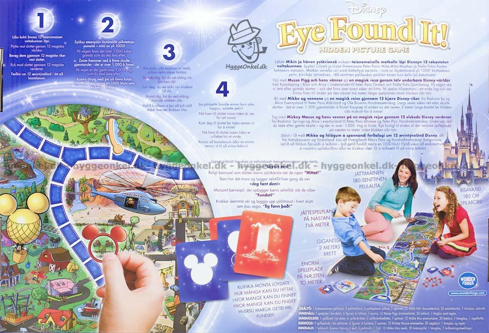 6 figurer - 6 holdere - 1 spinner - 12 Mikke Mus-øremerker - 30 søkekort - 1 timeglass - norske spilleregler.