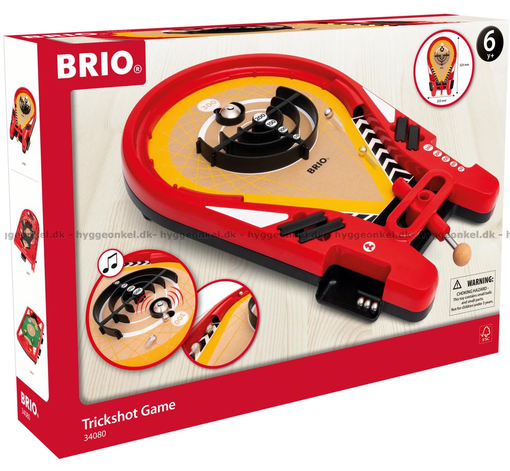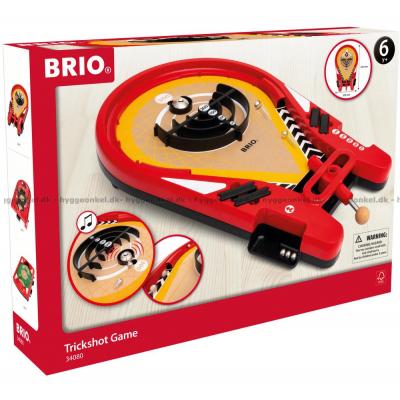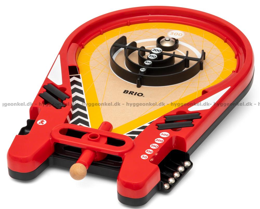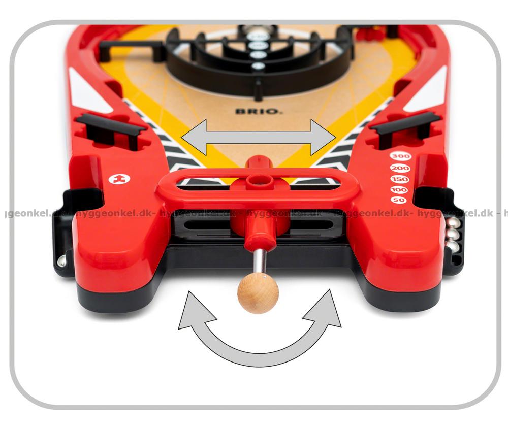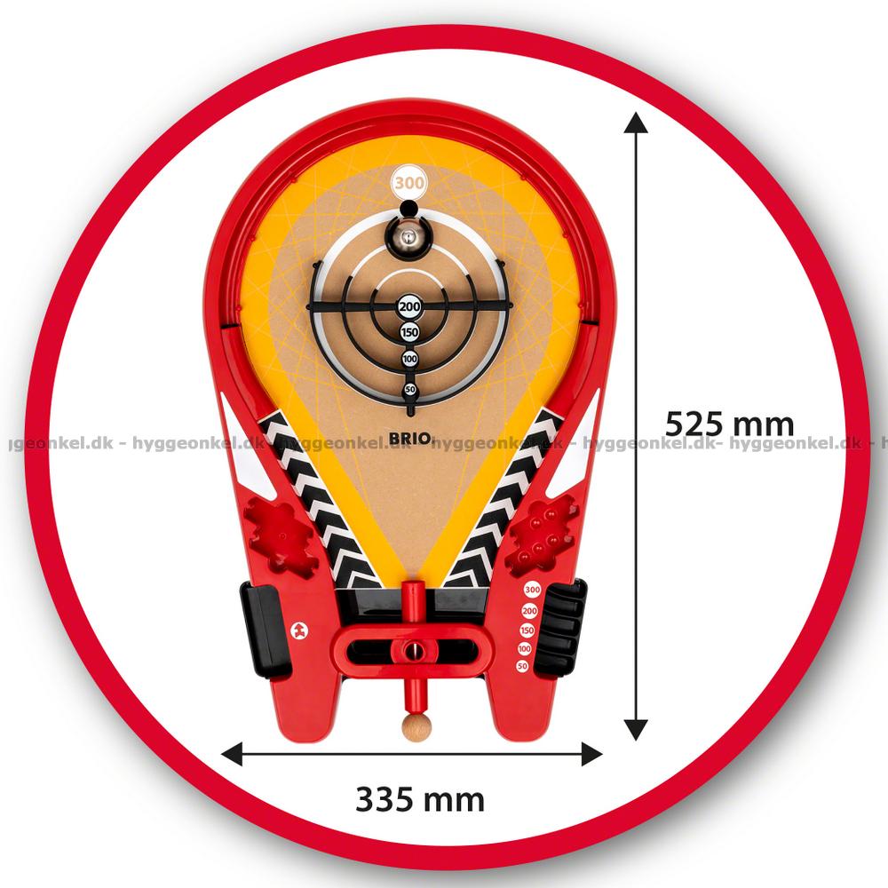 I esken finner du et flipperspill i plast og tre. Det mål-er ca. 50 x 30 x 5 cm. I tillegg medfølger metallkuler.