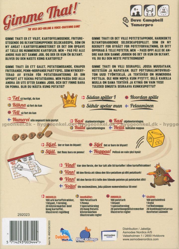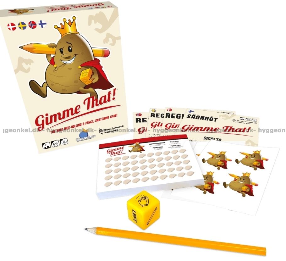 Gimme That! er et morsomt og hektisk spill, hvor målet er å telle 100 poteter på ditt potet-ark før de andre spillerne. Alle spillerne har samme oppgave, men det finnes kun én blyant, som raskt bytter hender gjennom spillet. Spillet starter når det ropes "1, 2, 3, POTET!" og spilleren med blyanten begynner å telle poteter, mens spilleren til venstre kaster terningen. Terningen bestemmer ulike handlinger som kan forstyrre tellingen, for eksempel "Gimme That!" hvor blyanten bytter hender.