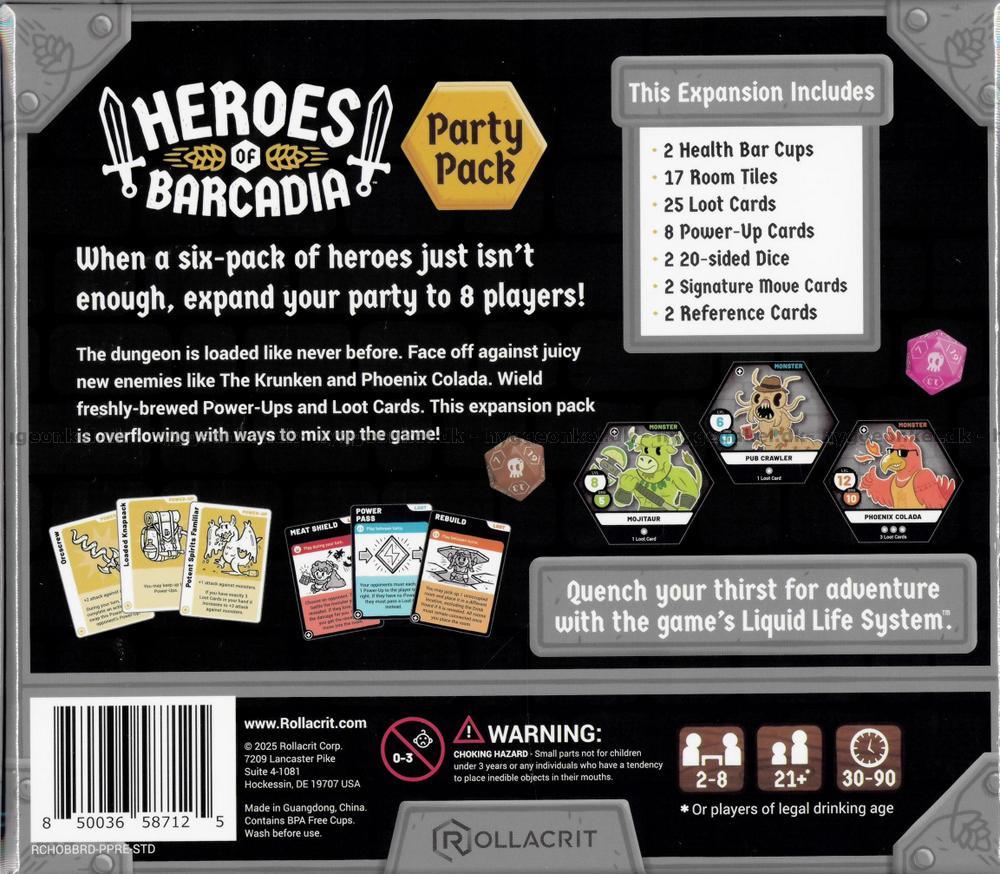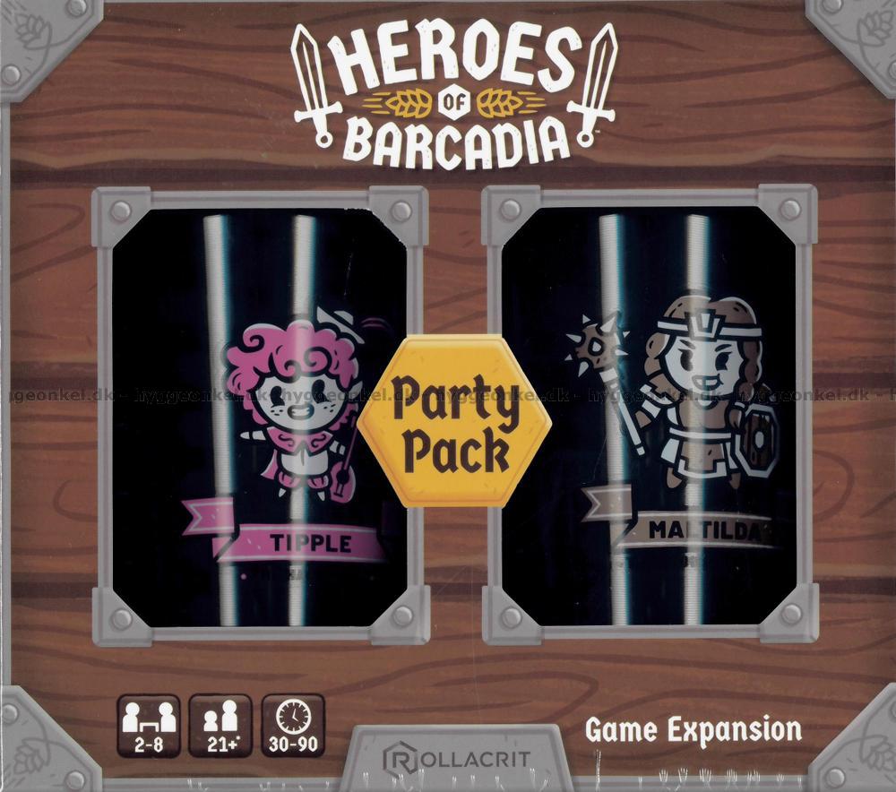 Party Pack legger også til ekstra Power-Up- og Loot-kort, som gir nye taktiske muligheter og overraskelser i spillet. Alle komponenter er vanntette, så du trygt kan ta med spillet til festlige sammenkomster der drikkevarer er en del av opplevelsen. Merk at grunnspillet Heroes of Barcadia er nødvendig for å bruke denne utvidelsen.