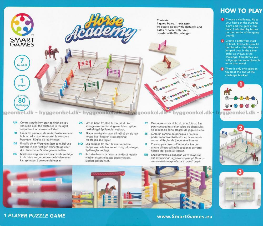 Hesten står klar ved sprangbanen, klar til å ta seg gjennom de mange hindringene. Kan du plassere bommene slik at hesten kommer seg riktig rundt på banen?
