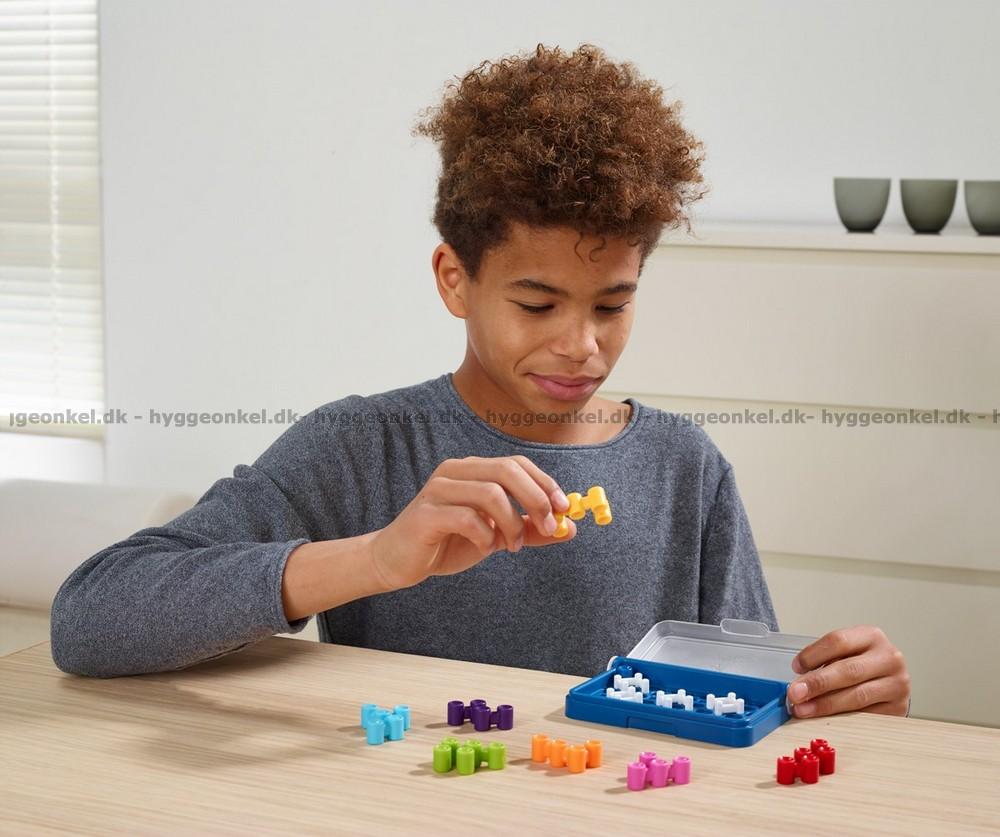 Spillet kommer i en praktisk plasteske som kan lukkes. Den kan enkelt tas med overalt og finnes frem når man har lyst på litt hjernetrim.