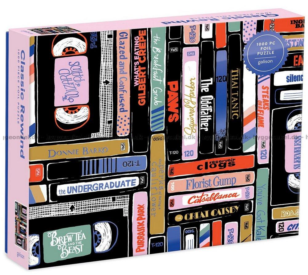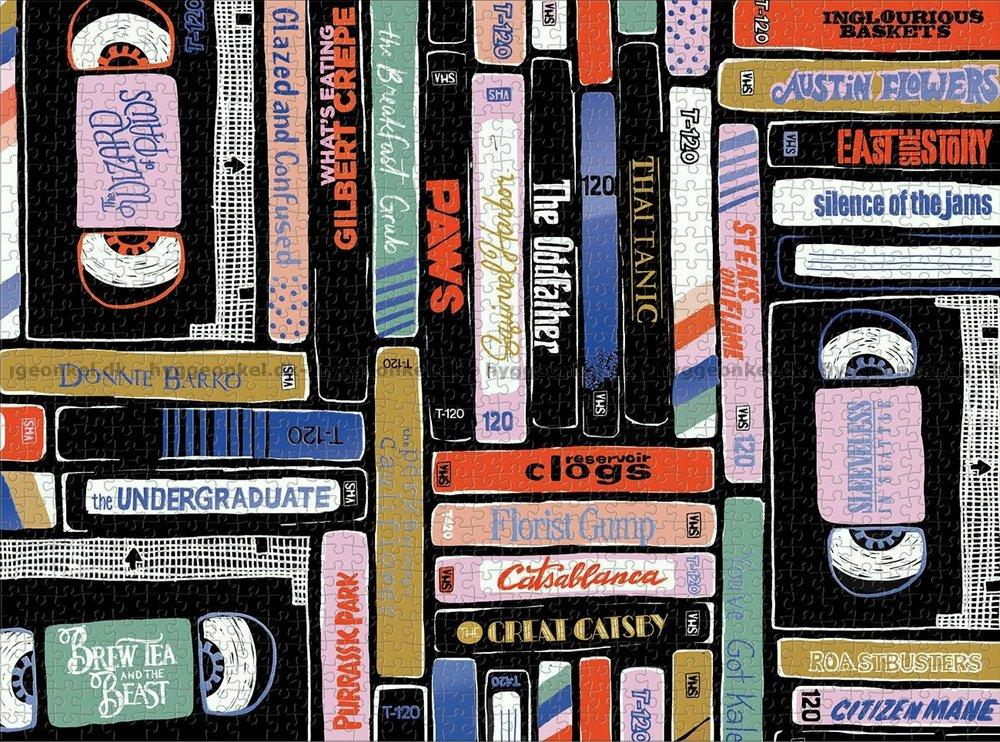 - En samling av fargerike VHS-kassetter som ligger tett sammen i et mønster. Hver kassett har sin egen unike tittel og fargekombinasjon