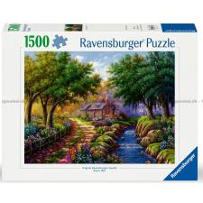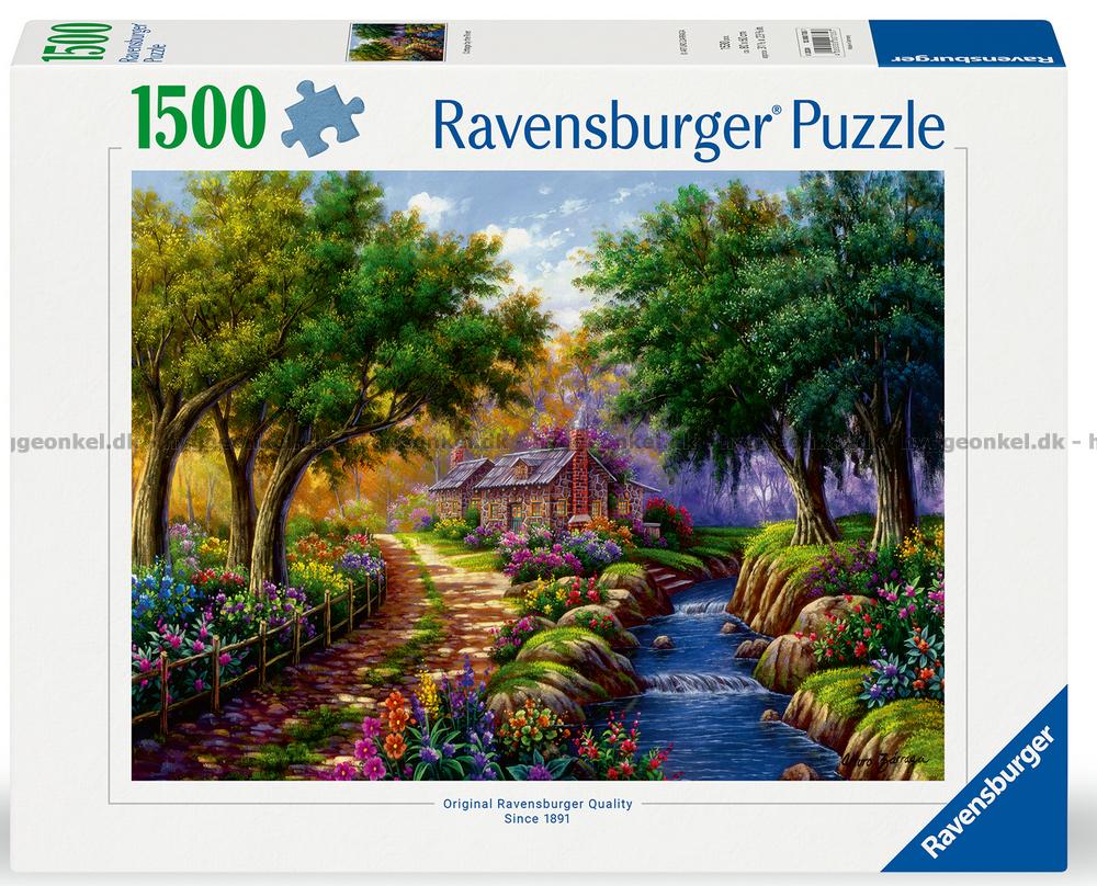 - Et sjarmerende hus ligger midt i et frodig landskap. Det er omgitt av fargerike blomster som strekker seg langs en svingete sti.