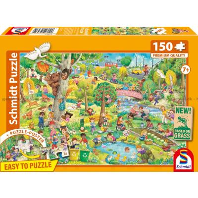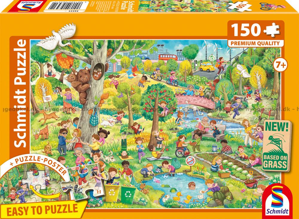 - Motivet viser en livlig park fylt med glade barn som leker og utforsker naturen. Fargerike trær og blomster skaper en munter atmosfære.