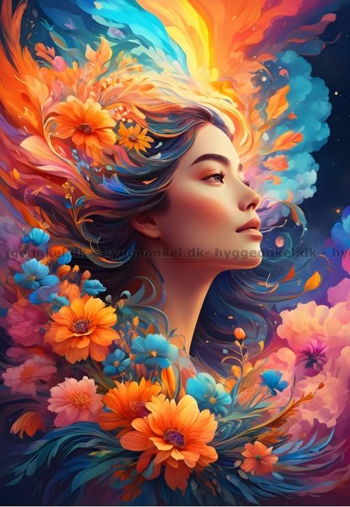 - Kvinnens ansikt er omgitt av fargerik blomsterprakt