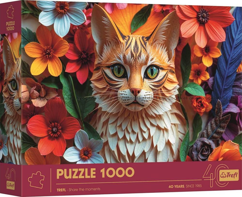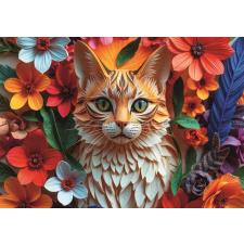- Katten omgitt av fargerike blomster i nyanser av oransje, rød, lilla og blå