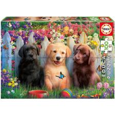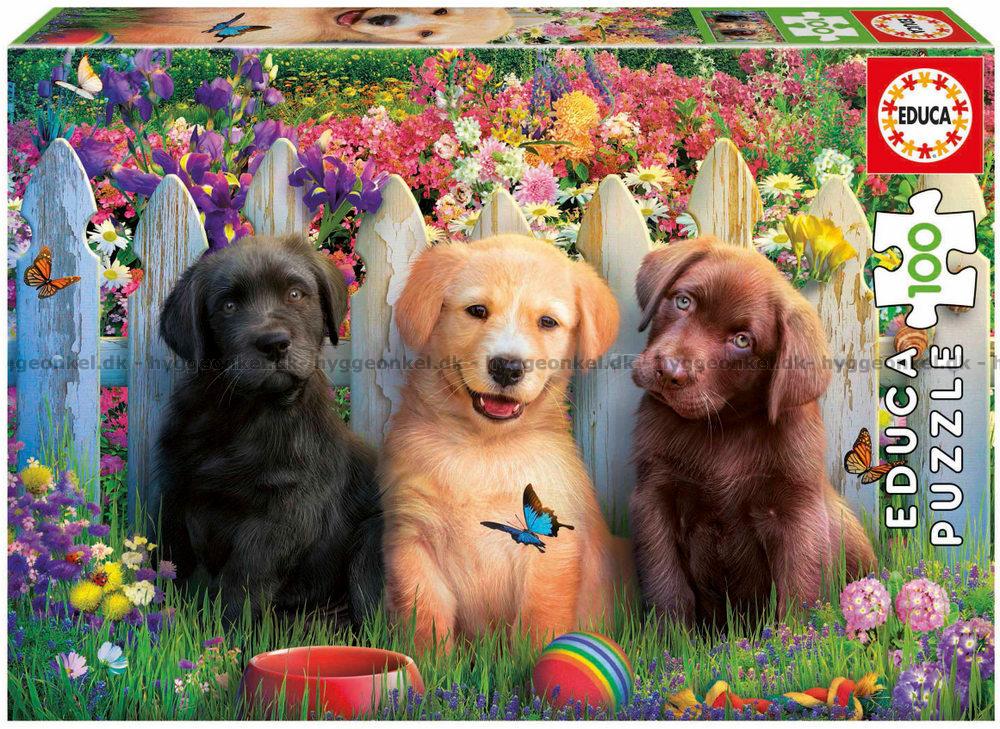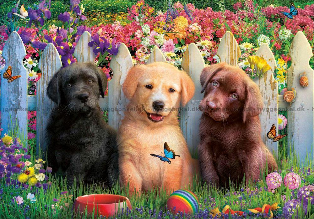 - De tre søte valpene sitter i den fargerike blomsterhagen