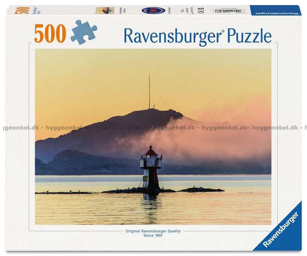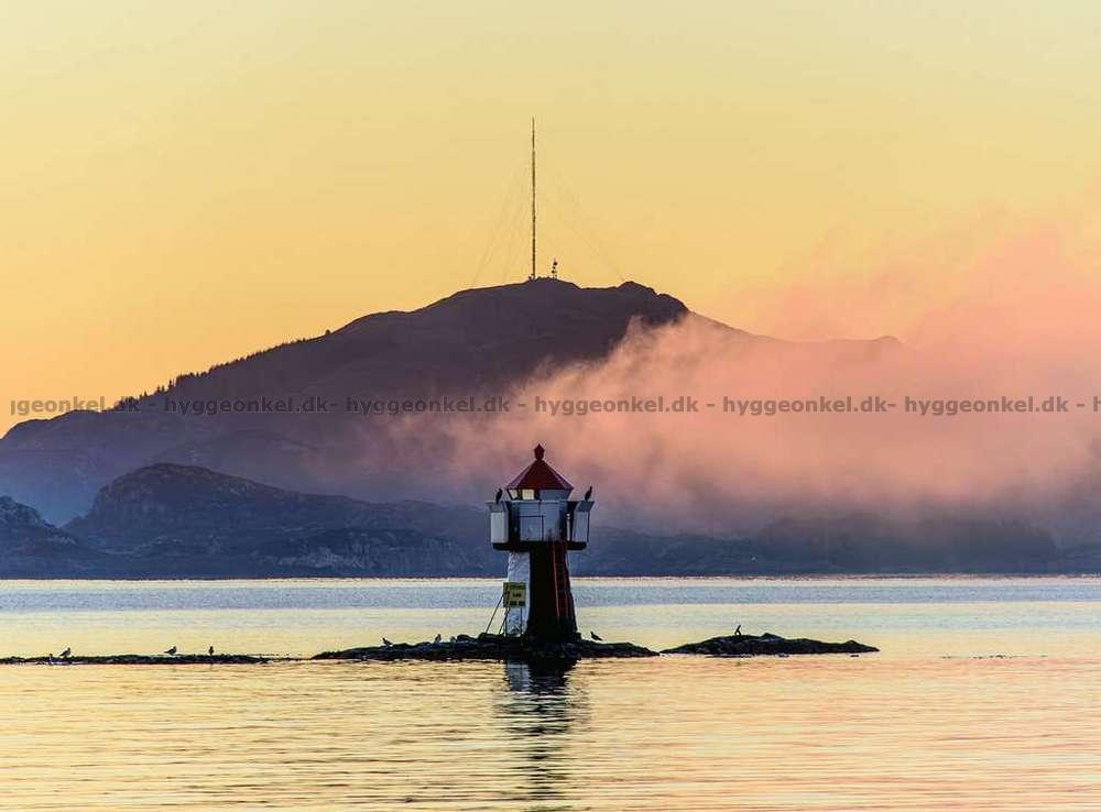 - På klippen står det lille rød- og hvitmalte fyrtårnet