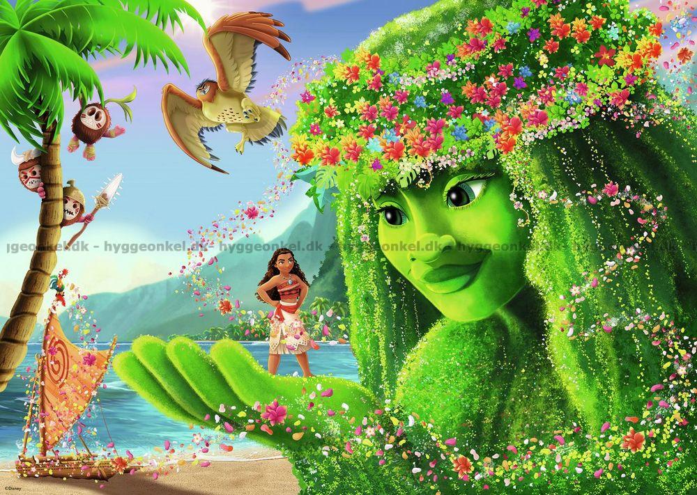 - Øygudinnen Te Fiti sammen med Vaiana. Bakgrunnen er preget av fjell og en klar blå himmel, som skaper en følelse av ro og eventyr