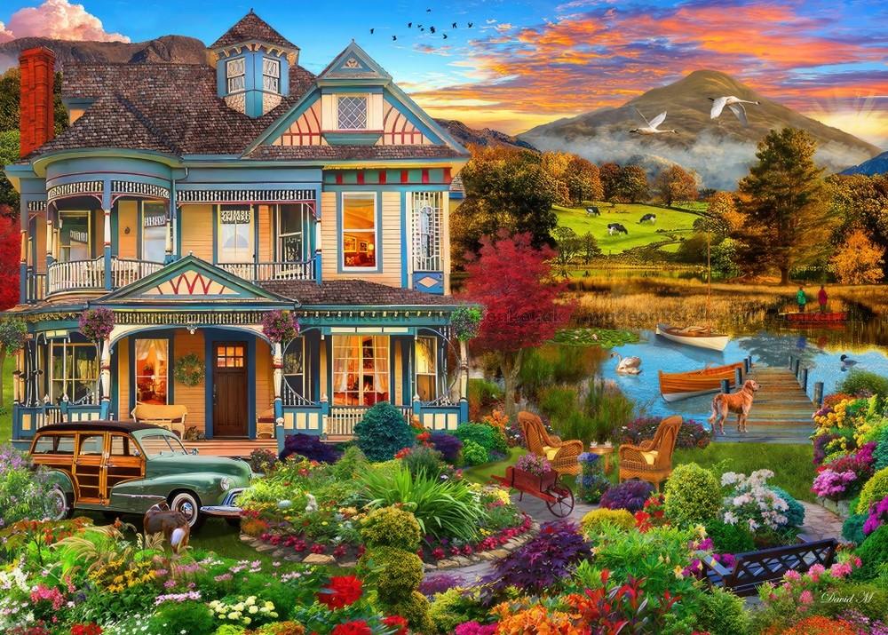 - Et sjarmerende landsted omgitt av en frodig hage og en stille innsjø. Solen går ned over de fjerne åsene, og himmelen er fylt med varme farger