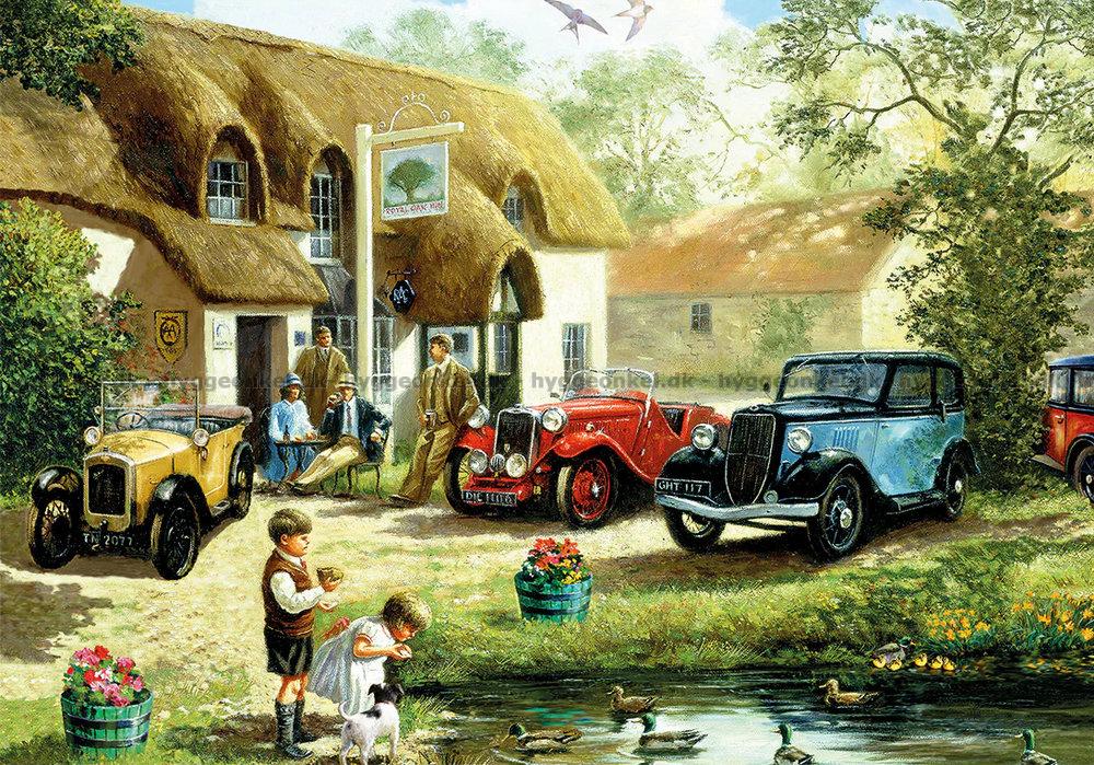 - De to barna leker ved dammen. Foran vertshuset står en rekke flotte biler parkert