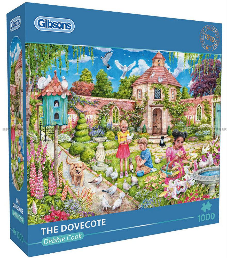 - En frodig hage fylt med fargerike blomster og glade barn som leker blant duene. En glad hund løper langs stien, mens flere duer flakser rundt