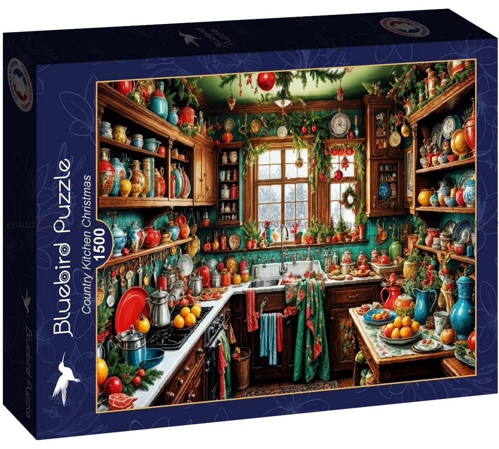 - Det gamle kjøkkenet er pyntet til jul med kuler, granbar og røde bånd