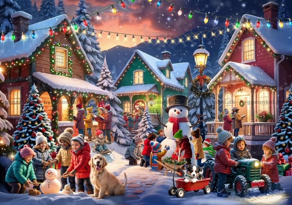 - Barn leker og voksne koser seg i det snødekte nabolaget. Husene er pyntet med fargerike lyslenker som lyser opp i den kalde vinterkvelden. En snømann ønsker velkommen til julekos.