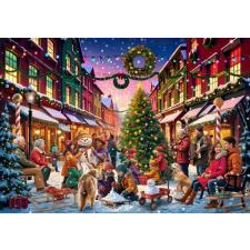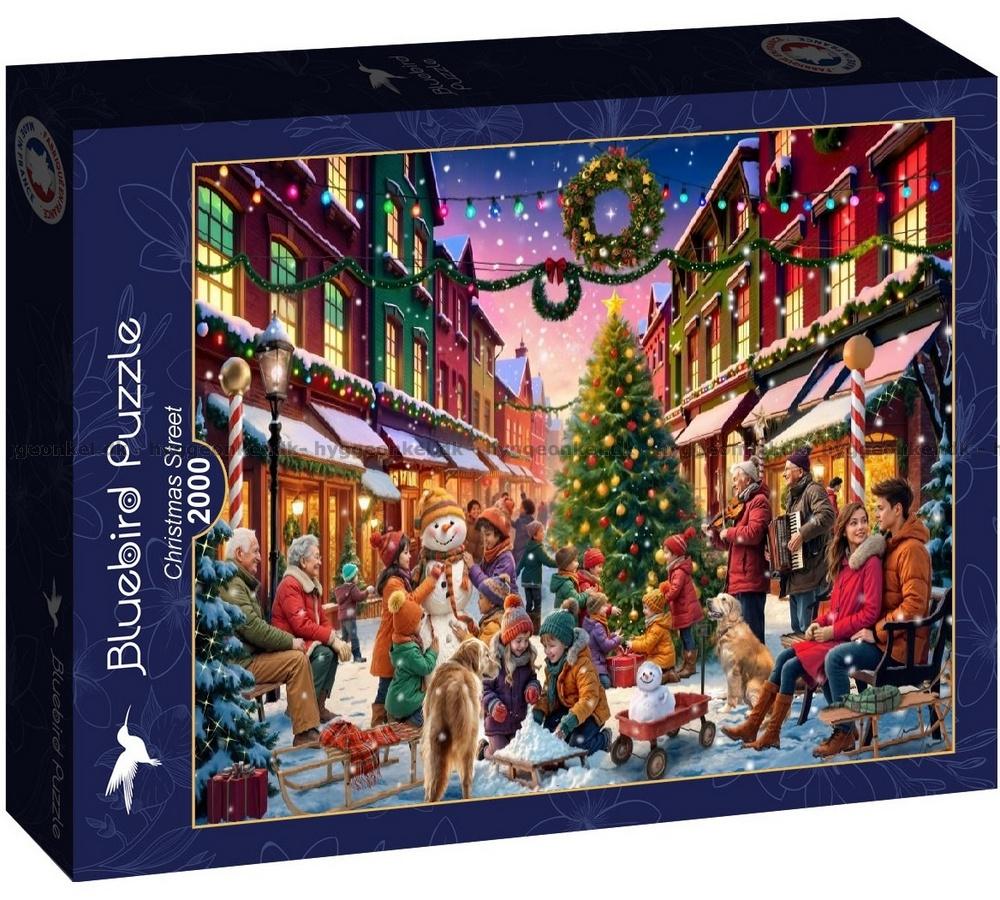 - Den livlige julegaten er fylt med mennesker som nyter den festlige stemningen. Fargerike lys og dekorasjoner pryder de omkringliggende bygningene. Et stort juletre, vakkert pyntet med kuler og lys, står midt i gaten. Barn leker i snøen og bygger en snømann, mens voksne sitter på benker og nyter synet.
