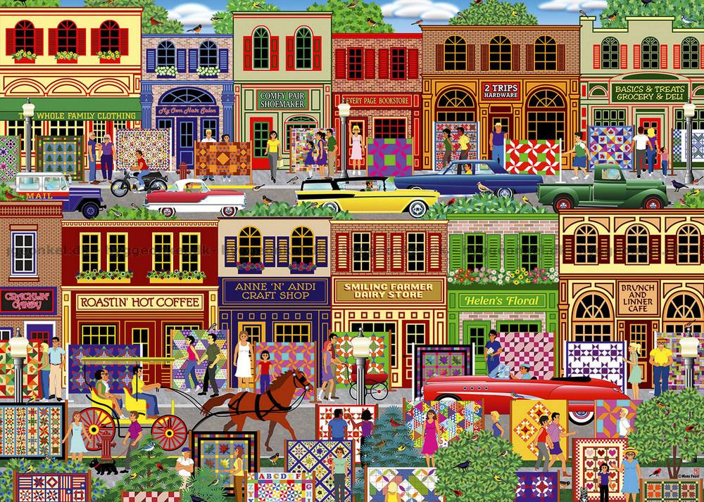 - I den fargerike gaten er de mange vatterte teppene utstilt