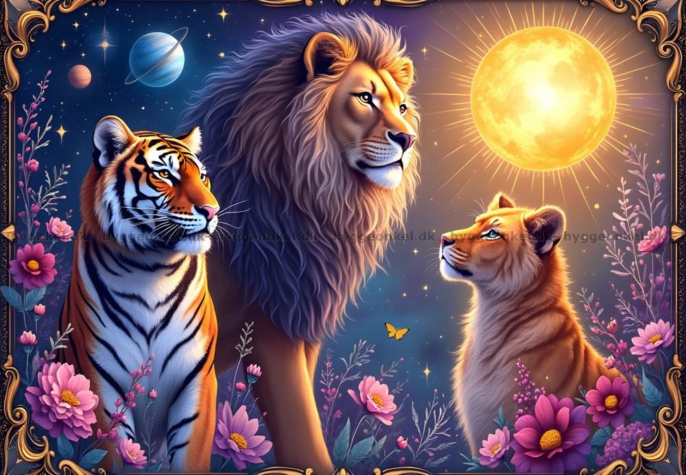 - Den majestetiske løven står i sentrum med sin imponerende manke