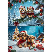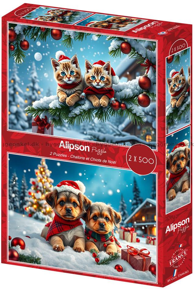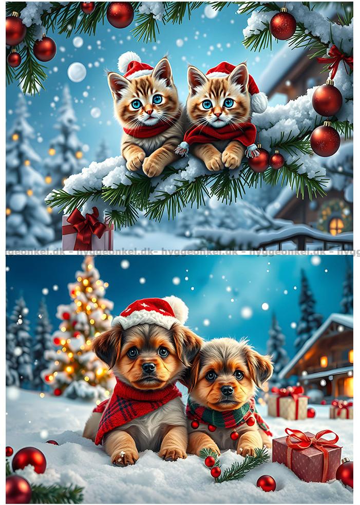 - På det ene motivet sitter to søte kattunger på en snødekt gren, mens det andre motivet forestiller to små valper i snøen