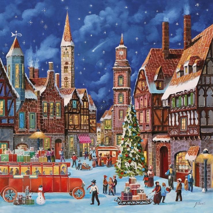 - På torget står et stort, pyntet juletre, omgitt av mennesker som nyter den festlige stemningen
