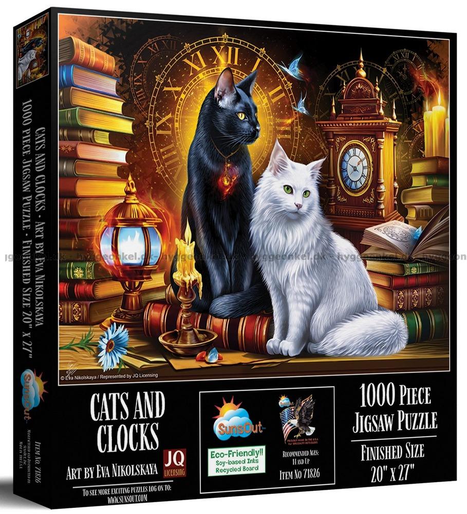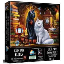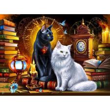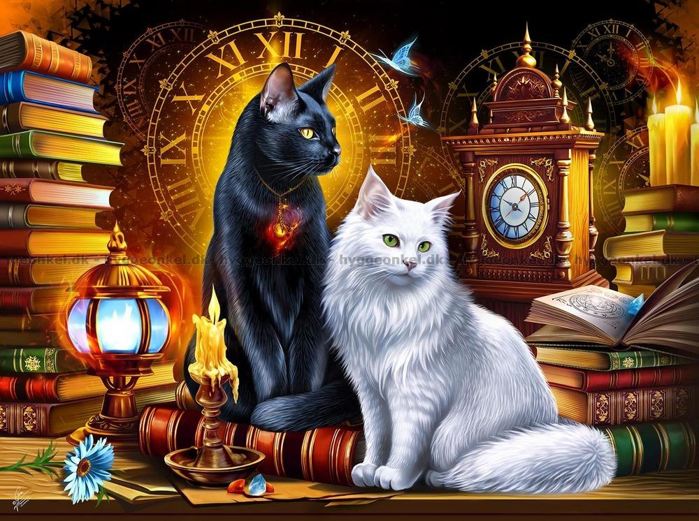 - To katter sitter majestetisk blant en samling bøker. Bak kattene en stor urskive med romertall