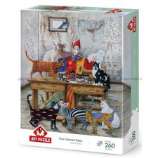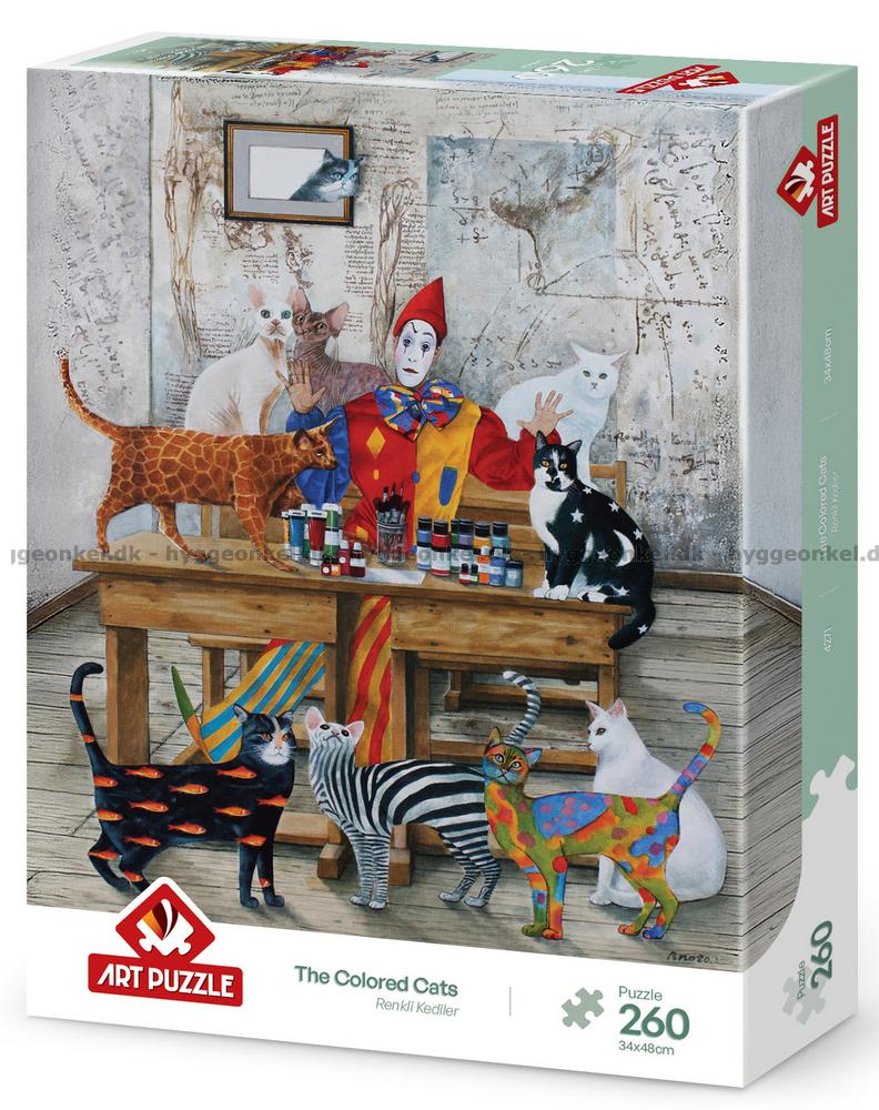 - Klovnen er omgitt av en rekke katter med kunstneriske mønstre