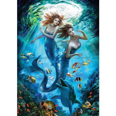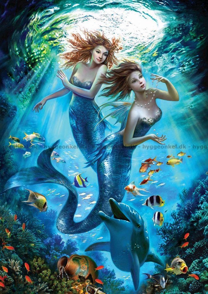 - To vakre havfruer svømmer elegant gjennom det klare blå vannet. Rundt dem svømmer en fargerik samling av tropiske fisk