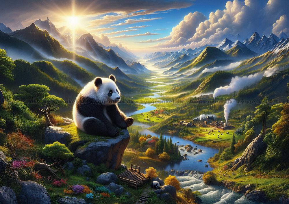 - Den store panda sitter majestetisk på en klippe og ser ut over et betagende landskap