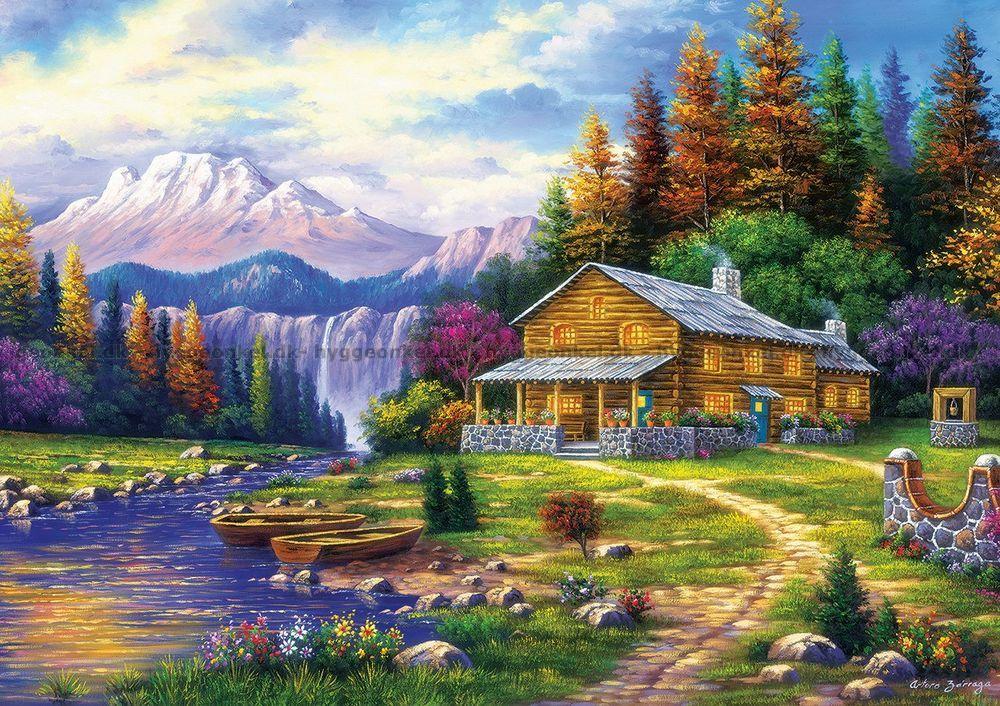 - Det sjarmerende huset står midt i et fargerikt landskap, omgitt av frodige trær i høstfarger. En elv slynger seg gjennom landskapet, hvor tre små båter ligger stille ved bredden