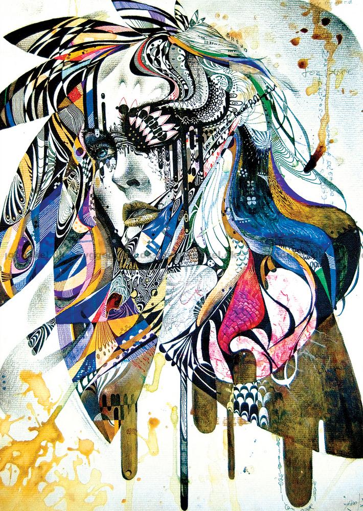 - Et fargerikt og abstrakt ansikt i en kompleks sammensetning av farger og mønstre
