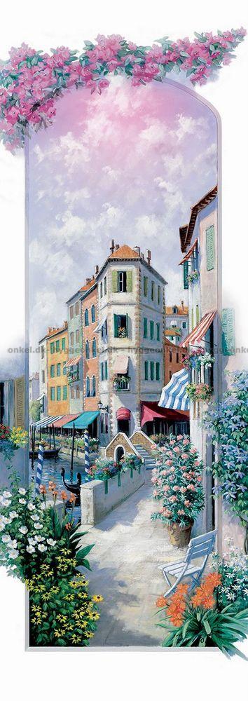 - Den smale kanalen slynger seg gjennom en sjarmerende venetiansk gate, flankert av fargerike bygninger. Blomster i alle regnbuens farger pryder gaten, med frodige planter som vokser opp langs husveggene.