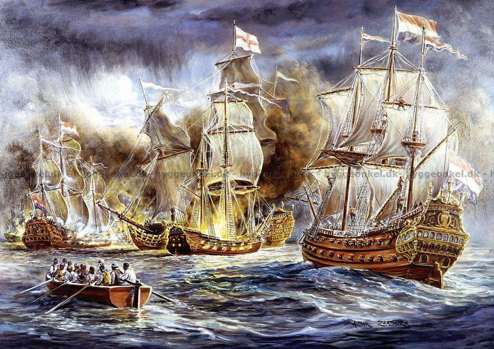 - De store seilskutene i intens ildkamp. Flammene slikker opp langs skipsidene og røyken fra kanonene blander seg med de mørke skyene